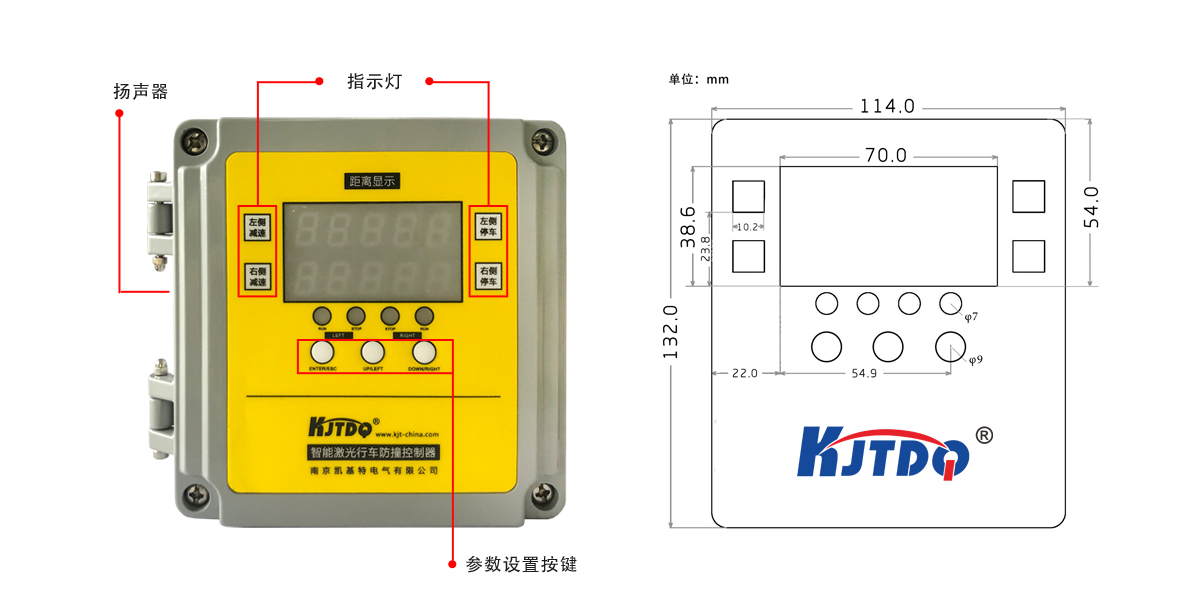 控制器功能主要是開機自檢功能,將激光傳感器接收到的信號進行處理和計算,根據檢測到的距離,作出相應的機電動作(語音報警和PLC控制)。可在0.5-35m的量程任意設定兩個距離作為減速和停車,安裝在司機室或電氣室梁內:控制器的功能主要是將激光傳感器接收到的信號進行處理,根據檢測到的距離,作出相應的繼電器報警和減速,停車動作,具有報警及語音提示等功能。