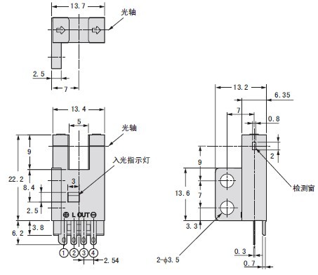 受光時指示燈亮,NPN集電極無輸出;遮光時指示燈滅,NPN集電極開路輸出DC5V--24V 、 100mA以下, 殘留電壓0.5V以下(負荷電流100mA時)、殘留電壓0.3V以下(負荷電流40mA時)